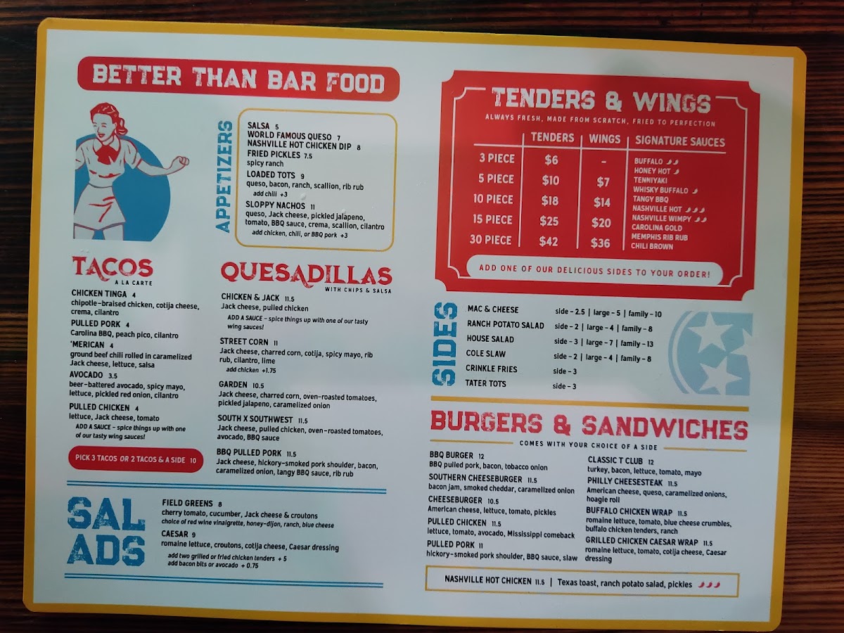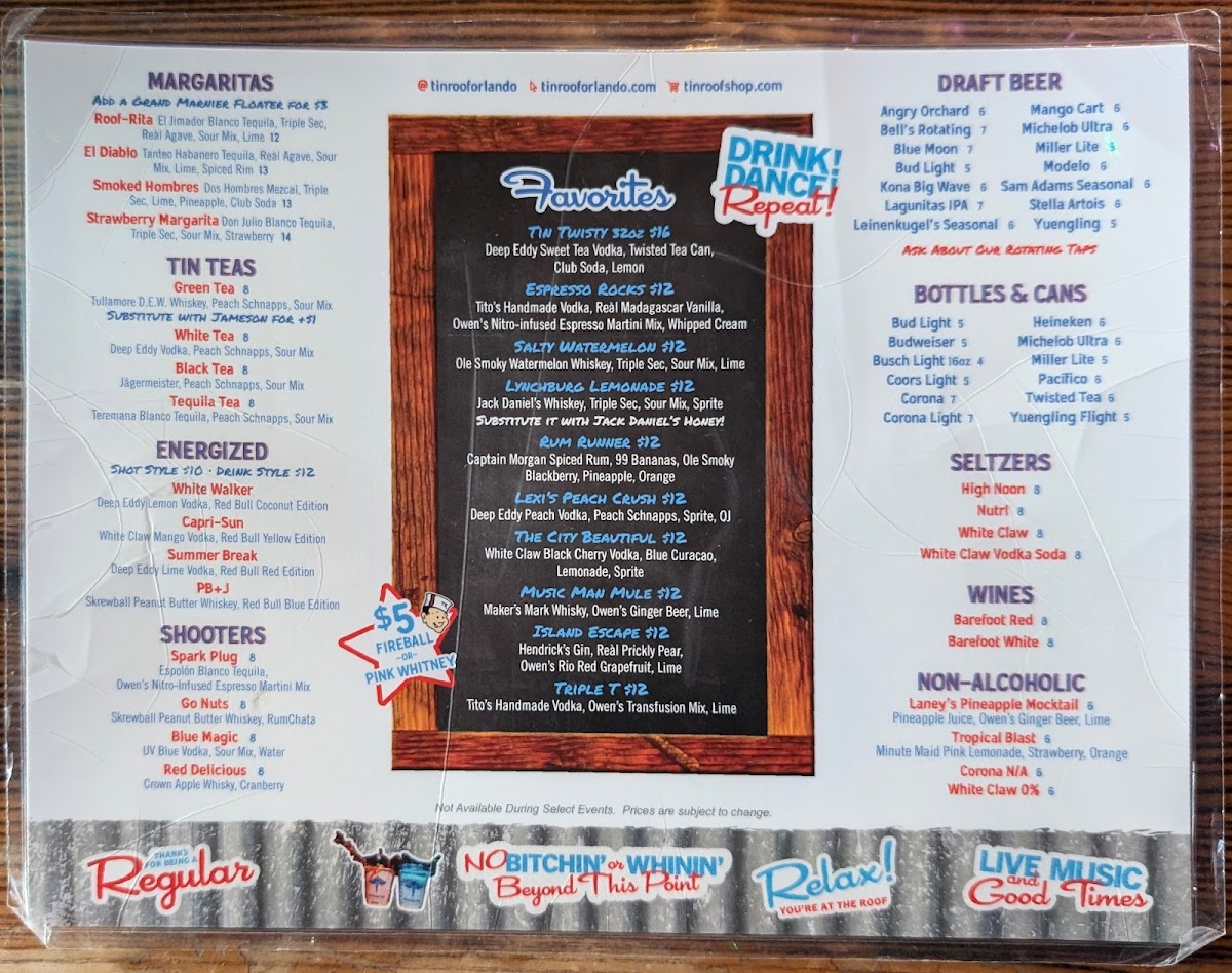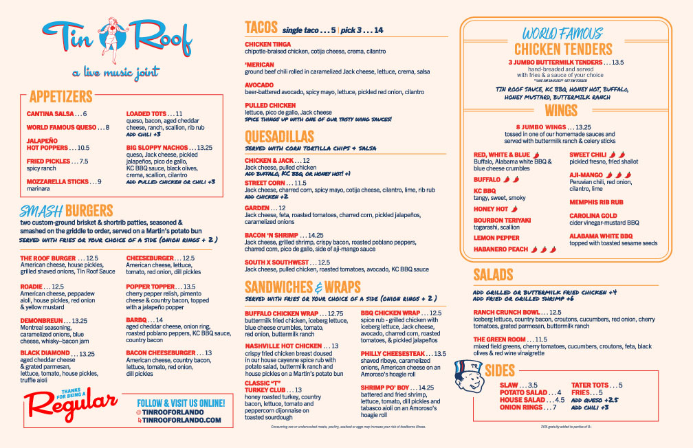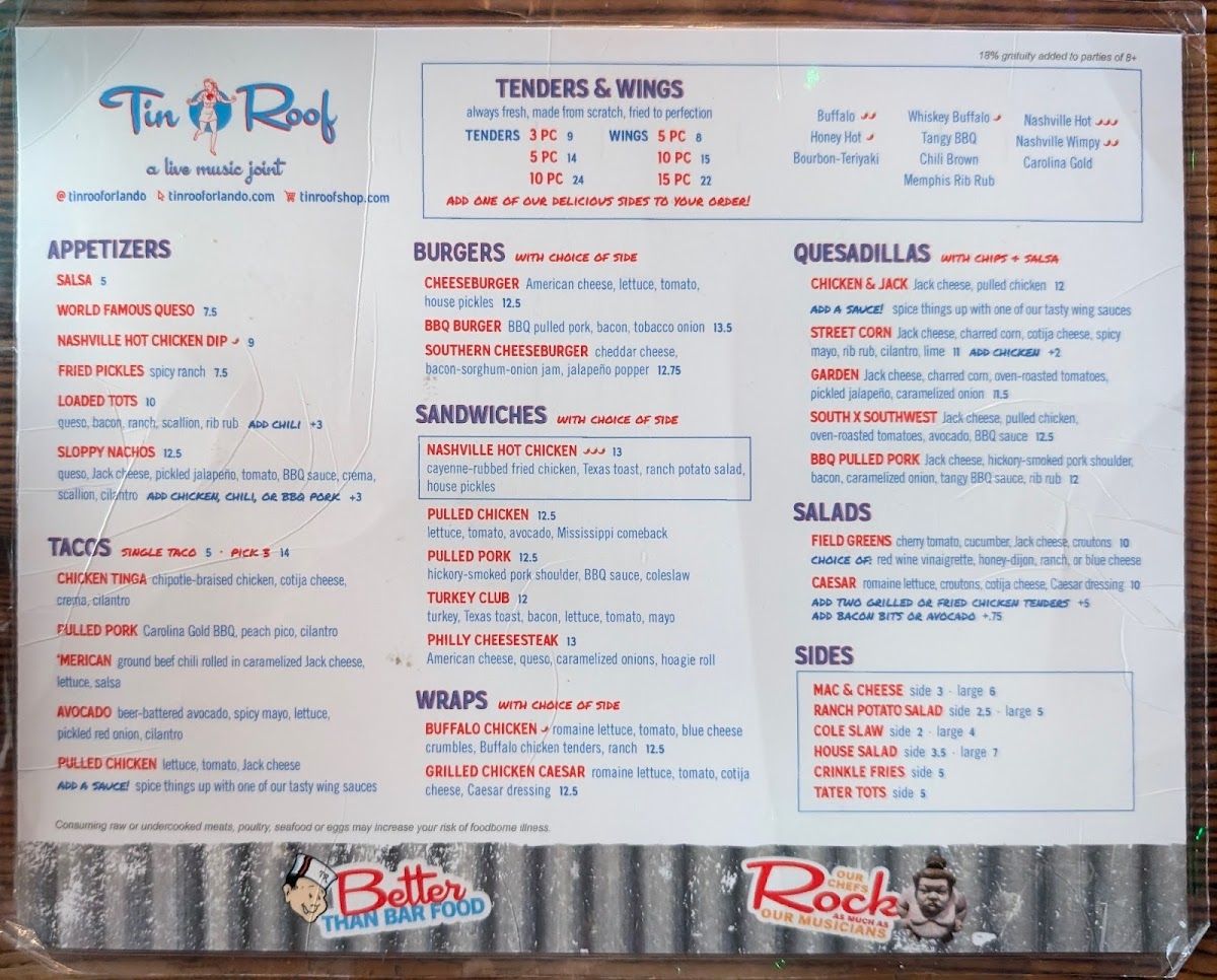Welcome to Tin Roof - Orlando, a vibrant spot nestled on International Drive at 8371 International Dr, Orlando. This lively venue perfectly blends the elements of a bar and a live music venue, creating a unique atmosphere for guests. The menu champions "Better Than Bar Food," featuring tantalizing options like fresh salads, crispy tacos, and hearty appetizers. Try the Sloppy Nachos or Fried Pickles for a delightful start, or indulge in their tantalizing tacos, available in varieties like Chicken Tinga and Avocado beer-battered. Each dish is crafted to elevate your experience and paired perfectly with an extensive drink selection. The energy here is infectious, fueled by live music and enthusiastic bartenders who keep the vibe alive. Whether you seek delicious bites or a night out filled with entertainment, Tin Roof offers a memorable dining experience that resonates with locals and tourists alike.